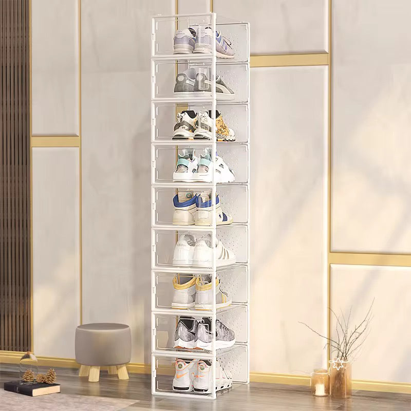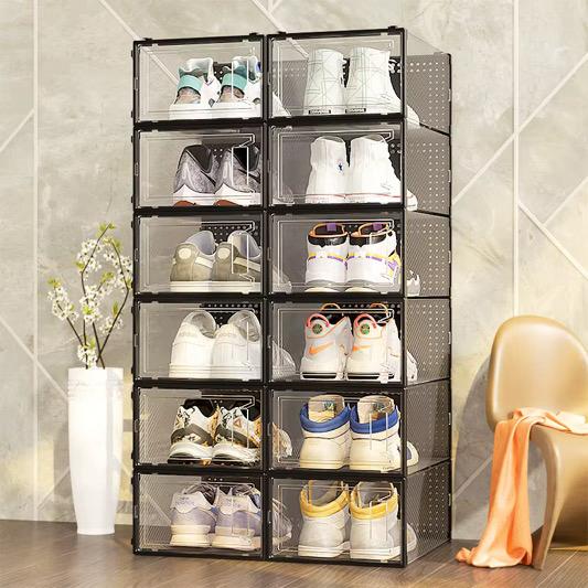 This Shoe Box is made of acrylic and PET material, it is super transparent, and easy to install. It will help organize your shoes and your space neatly.