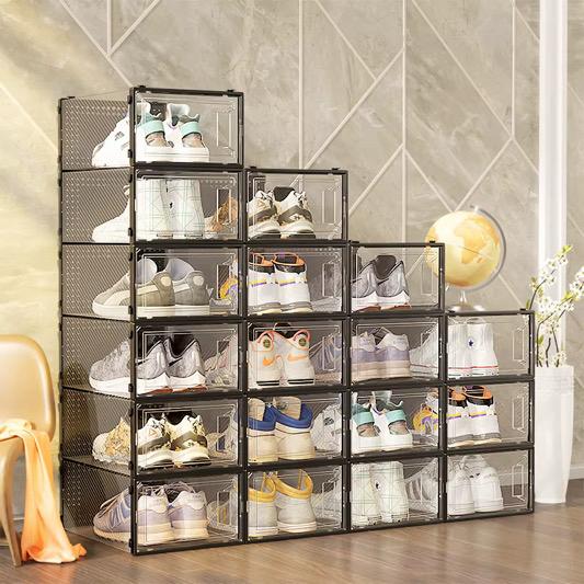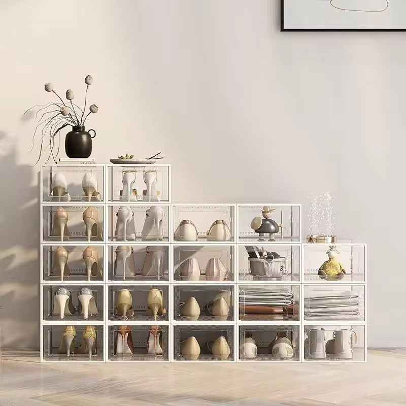 These shoe boxes have a completely clear door, which allows easy viewing of the shoes within. You can take out your shoes without removing the box.